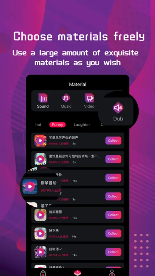 [Thousands of materials] Dubbing, sound, video, music four categories of materials; Funny, cheerful, tender, sad, inspirational, shocking and other 64 small classified material collection. In the future, the material will expand to more than 100,000, becoming the material and preferred source of inspiration for mobile video production.