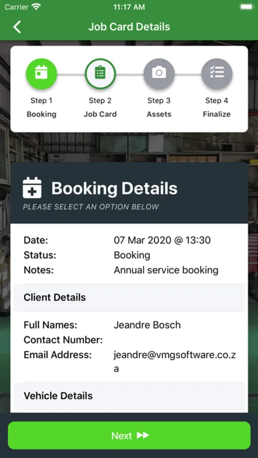 The VMG Workshop Mobile app enables your team to open and edit Clients, Vehicles, Bookings and Job Cards. It also enables your workshop team to add photos of Vehicles to Job Cards. These date and time stamped images can then be sent with Job Card data to your customers via email. Taking photos of Vehicles as they arrive protects you and your customers from misidentifying damage to Vehicles that you or your customers may feel was caused by members of your workshop team.