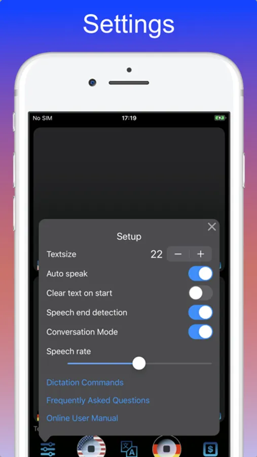"Translator - Translate Speech" allows to dictate and translate using your voice. It uses speech recognition technology and translates into 40 languages. Just use Translator and your voice to make conversation in any language.