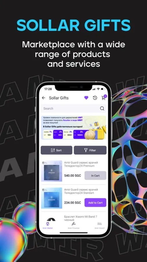 - Built-in Sollar Gifts marketplace with a wide range of goods and services delivered worldwide. Payments in crypto are accepted.