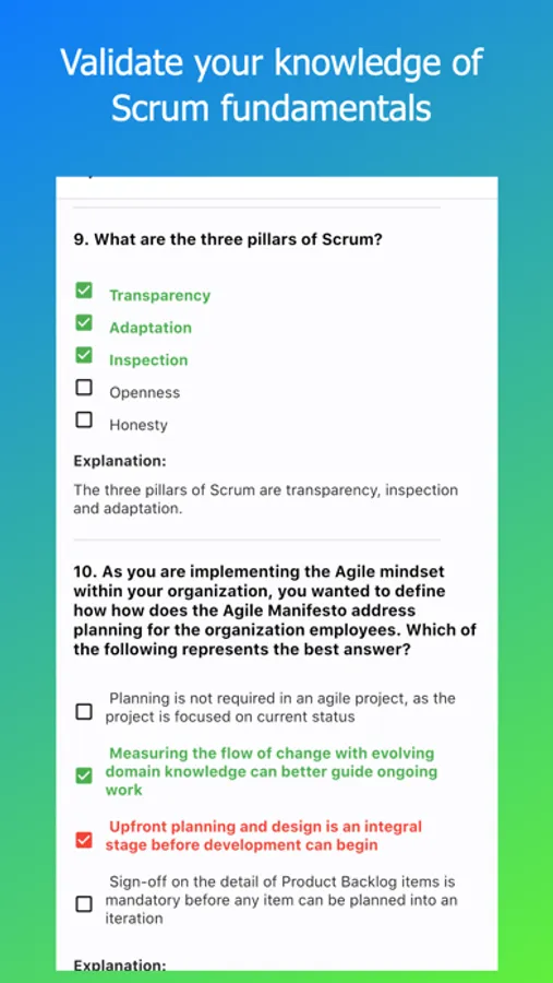 Detailed explanations on each question will enhance your Scrum Guide knowledge.