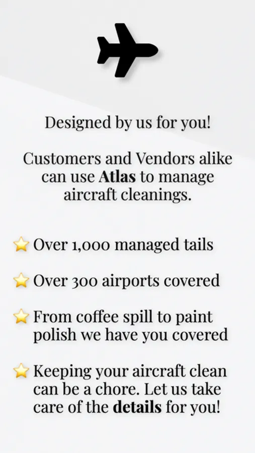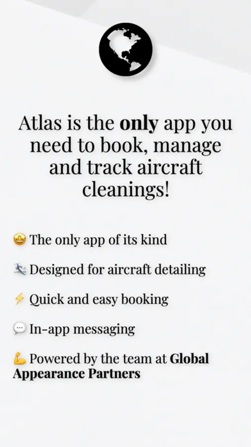 Atlas is the only application of its kind designed exclusively for Global Appearance Partners. It serves as the platform to book, manage, and track aircraft cleanings. We offer both customer and vendor facing tools and experiences so managing cleanings is just a few taps away. For more information of if you have questions, please contact us at info@global-appearance.com