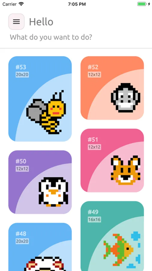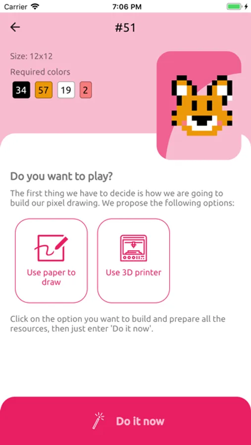 Blow your stress by drawing Pixel Art! With this application you will be able to create pixel images in the real world, we will help you create the images on paper, with a 3D printer, Hama beads or any other way you can think of. Be creative!
