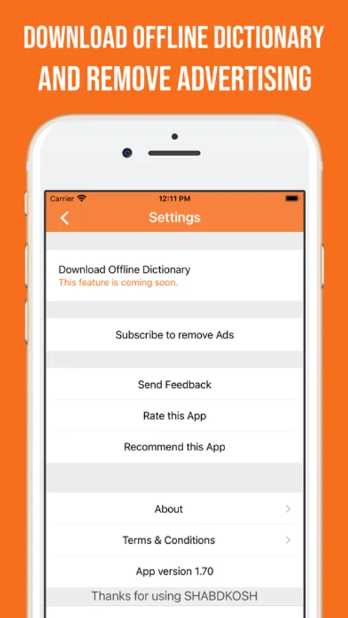 - Offline dictionary (coming soon) downloadable from the Settings screen within the app