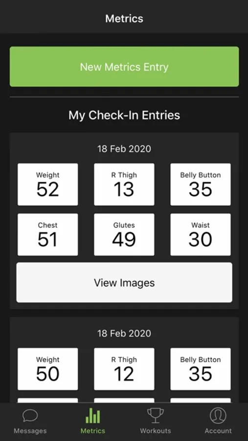 - Metric upload area to submit your measurements and progress pictures.