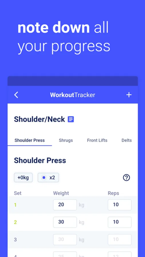 Easily set up your training routines by using custom exercises. Take note of reps, weights, and distances while executing.