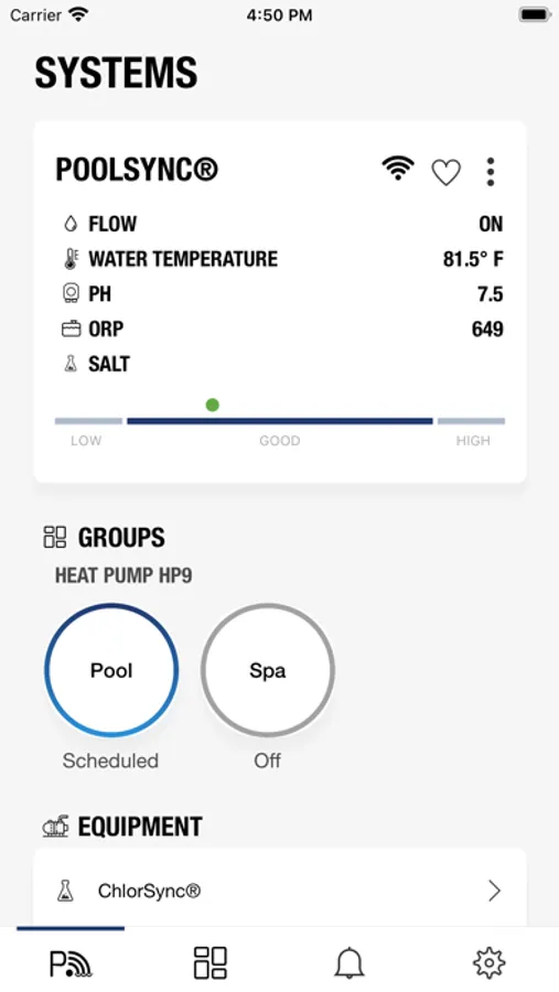 Effortlessly control PoolSync™ Ready equipment from your iOS device. Adjust the heat pump set point, change the sanitization level, create schedules and receive alerts when action needs to be taken. Home or away always be in sync with your pool.