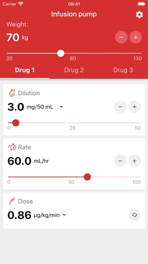 Application to calculate the dose of continuously (by infusion or syringe pump) administered drug.