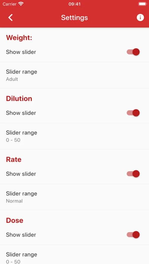 You can choose from several different volumes of infusion or syringe. It also calculates the concentration of the solution.