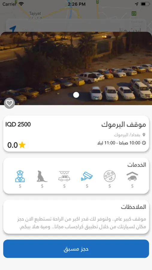 تطبيق يخليك مأمن عله سيارتك متخاف من المرور ومتظيع وقتك بالبحث عن موقف.. لان كراجساب يجمعلك مواقف بغداد الموثوقة والرسمية ويدليك الطريق المؤدي الها ويستعرضلك خدمات كل موقف (حراسه، مؤمن بالكاميرات، مبيت للسيارات..) حته تختار الموقف الي يناسبك بسهولة، وبالنسبة للأسعار راح تكون انسب مما تدفع حاليا