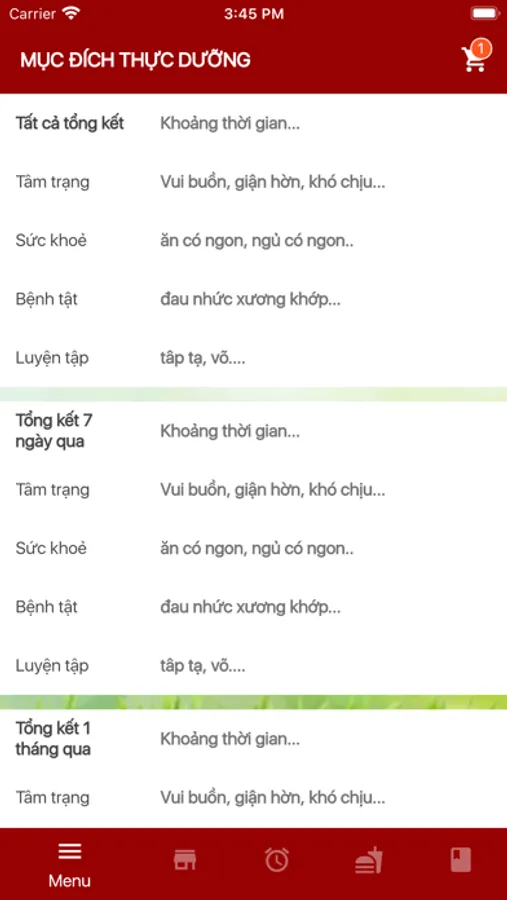 -Trong trang 3 là trang tổng kết của trang 1 và trang 2. Trang tổng kết sẽ cho ra kết quả từng ngày, từng bữa ăn, từng cảm nhận ăn uống... và bạn sẽ dễ dàng xem 1 quá trình ăn uống của bạn trong suốt thời gian cập nhật thông tin ăn uống. Và bạn sẽ dễ dàng tìm thấy sai lầm trong ăn uống hoặc bạn sẽ nhờ chuyên gia Thực Dưỡng xem. Sau đó, bạn điều chỉnh cơ thể lại qua Âm Và Dương trong thức ăn.