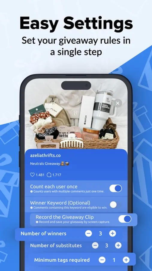 • Set your giveaway rules (number of winners/tags, etc.) and let Easy Giveaway® take care of the rest.