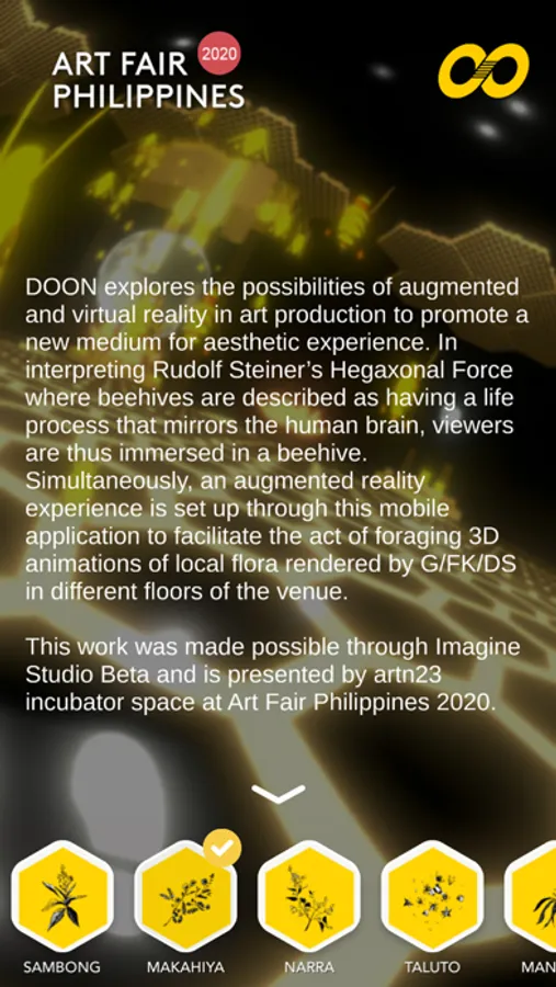 DOON explores the possibilities of augmented and virtual reality in art production to promote a new medium for aesthetic experience. In interpreting Rudolf Steiner’s Hegaxonal Force where beehives are described as having a life process that mirrors the human brain, viewers are thus immersed in a beehive. Geared towards rhythmic movement, DOON makes use of the immersive capacity of the VR space to illustrate and give life to one of nature’s seven wonders— the nonverbal communication of bees in a hive. The experience focuses on the goal of “guiding” one’s hive mates by performing signals based on Karl Von Frisch’s greatest contributions to the ethological study of bees called the waggle dance— a figure 8 movement done by bees to show a potential source of nectar and pollen harvest.