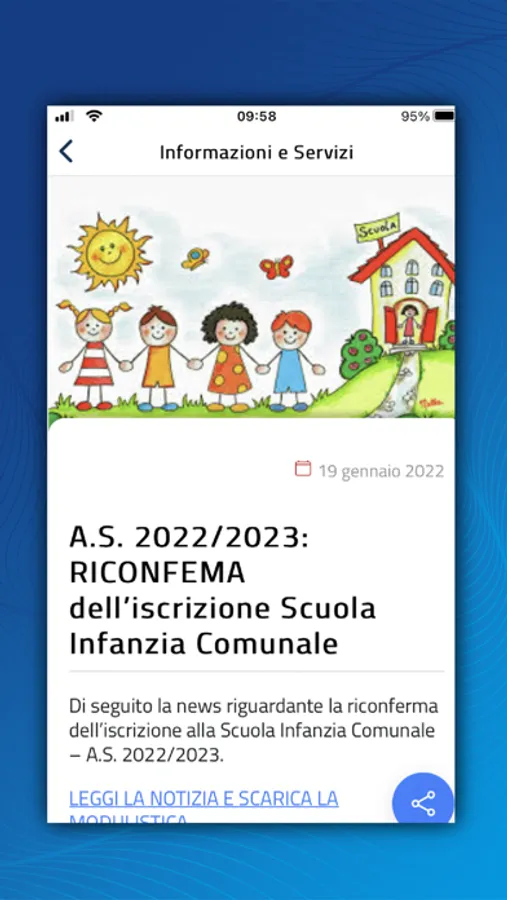 Inoltre, tramite i tasti di condivisione social, direttamente dall'app potrai condividere le notizie del tuo Comune sui principali social network, con un semplice click.