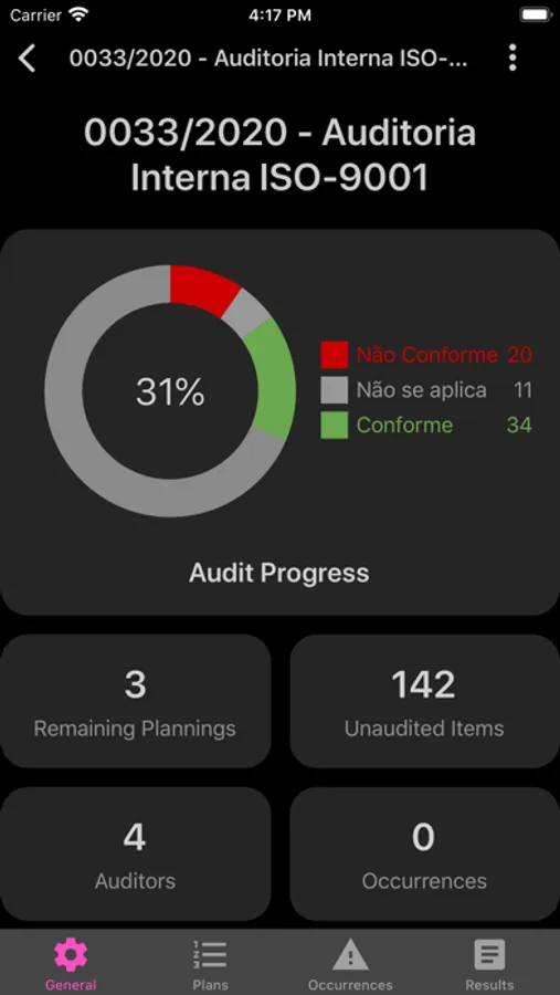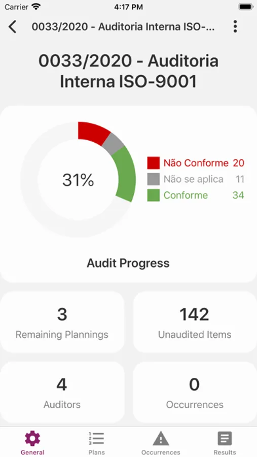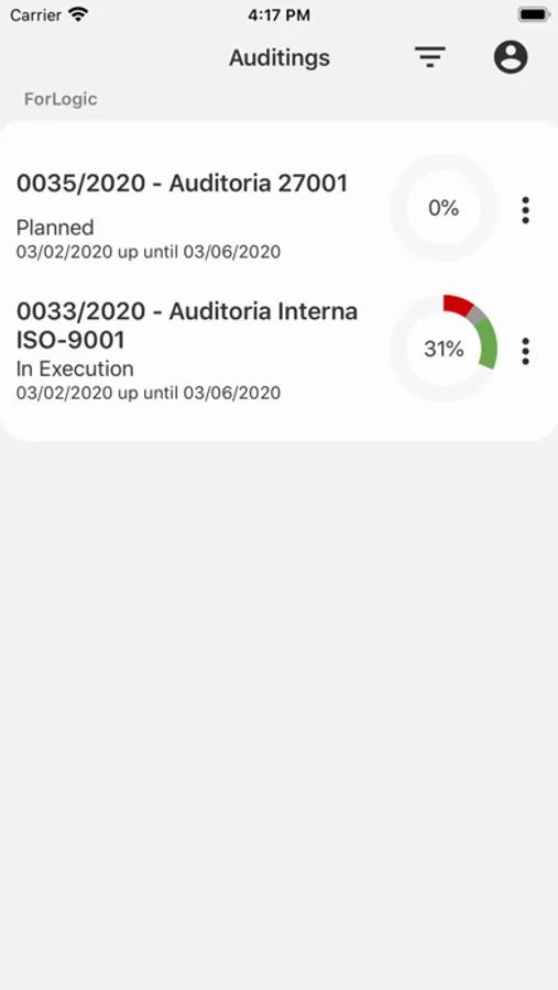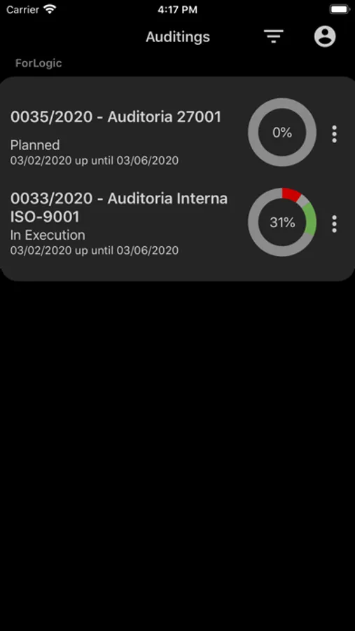 Por meio de uma dashboard simples e intuitiva, o Qualiex Auditorias App possibilita que você acompanhe facilmente o andamento da auditoria, visualizando a porcentagem de itens já auditados.