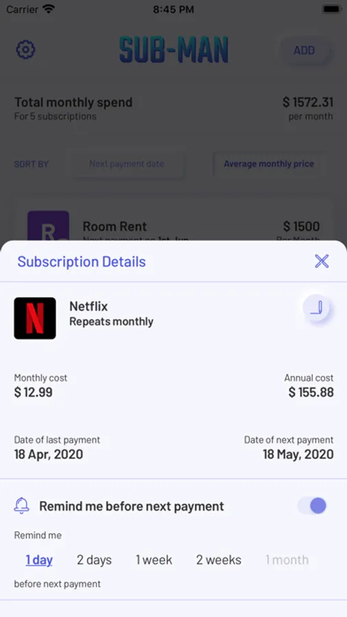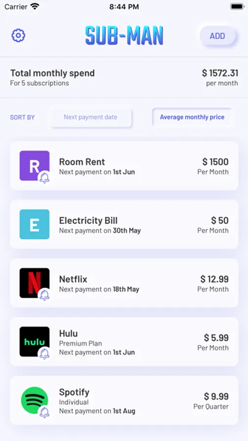 SubMan provides a clear view of all your subscriptions or recurring bills. By this, you will always know the amount of money spent on subscriptions, which ultimately helps you to control your monthly spendings.