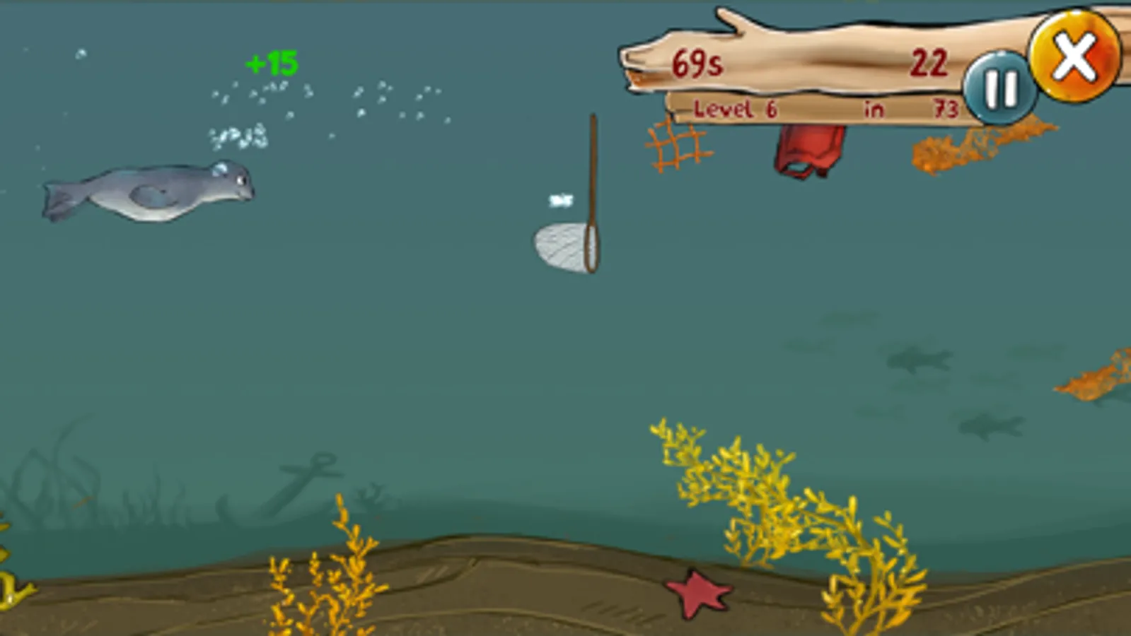 In the Litter Fisher game, you have to tap the screen to move the net to collect the litter before the cod eats it. You can advance to different levels while playing. The aim is to unlock additional animals, such as a seal or porpoise.