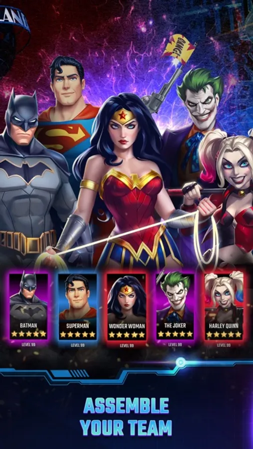 Strengthen your team and unite with others across the DC universe. Work together to fight injustice and defeat foes and bosses for awesome rewards in limited time events. All DC Comics heroes and villains including Batman, Superman, Blue Beetle, Wonder Woman, the Joker, Aquaman, and The Flash can be upgraded to become more powerful.
