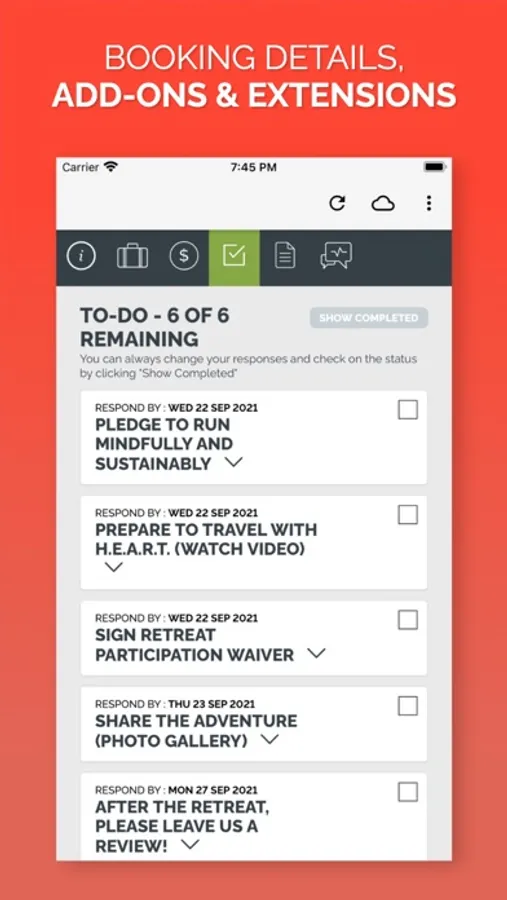 You'll get notified when there are tasks due for your trip, so you don't have to worry if you missed a deadline to book a flight, pay for an excursion, or sign up for a cooking class.