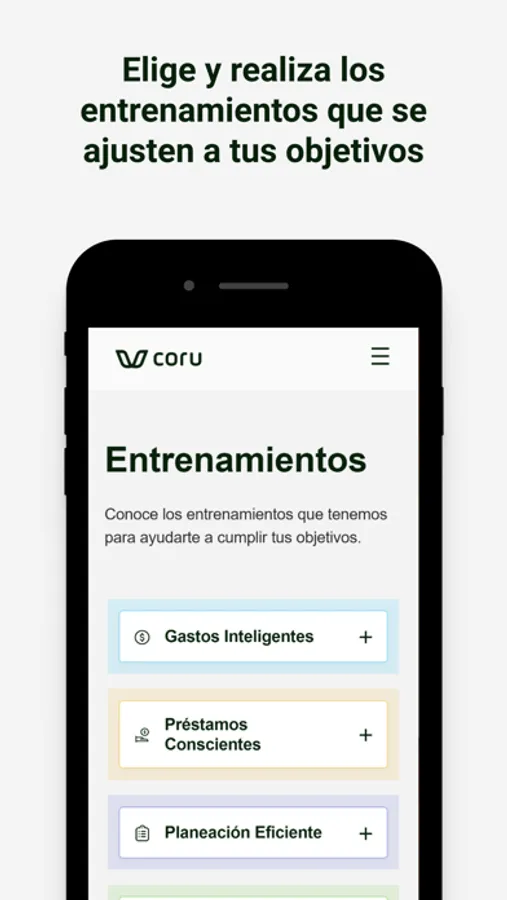 Coru es el único gimnasio financiero donde por medio de entrenamientos podrás desde obtener la tarjeta de crédito ideal para ti, hasta realizar tu primera inversión.