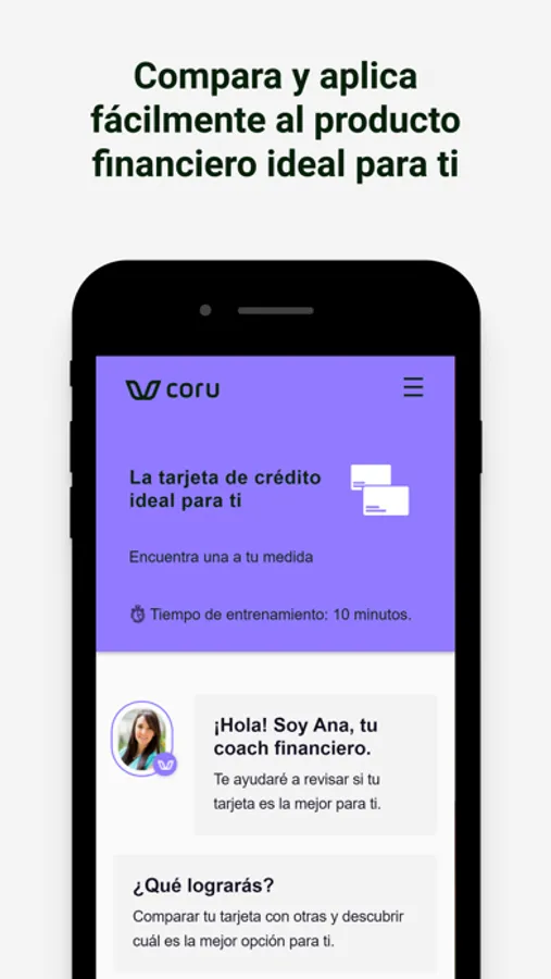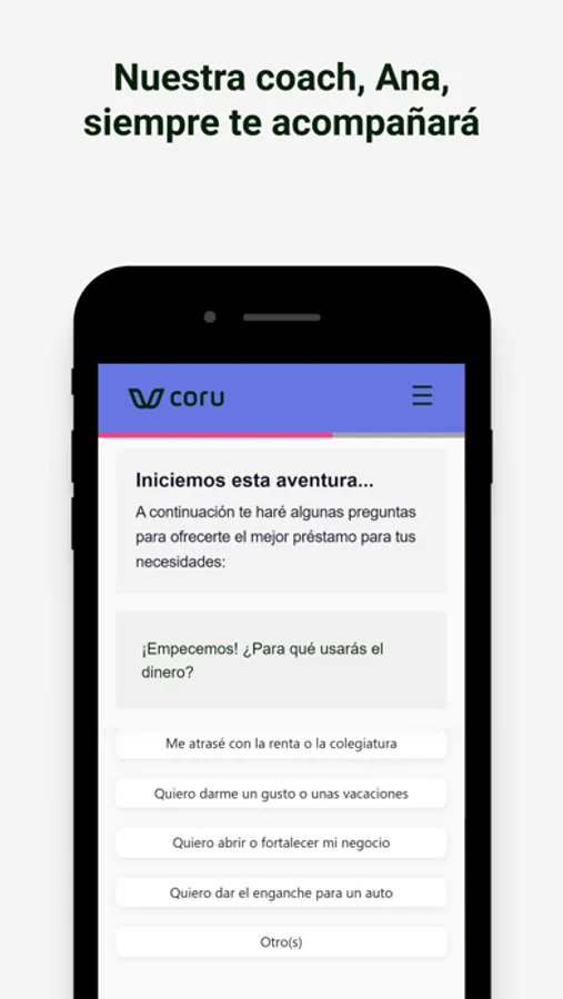 No importa si quieres irte de viaje, crear una empresa o eliminar tus deudas. Coru te ayudará por medio de Ana, nuestro coach financiero virtual, a elegir la forma más fácil y simple de cumplir tus objetivos.