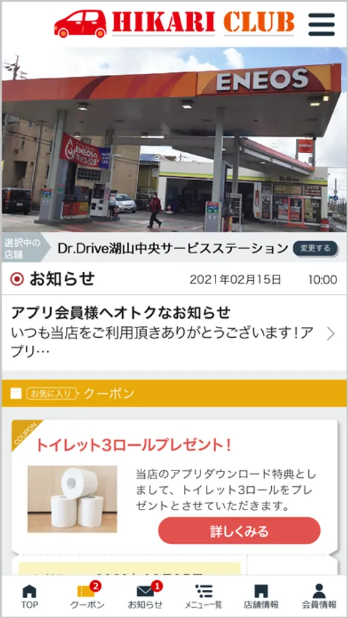当社のアプリ「HIKARI CLUB」ではアプリで簡単に洗車・コーティングなどのご予約や愛車のメンテナンス管理が可能の他、ご登録いただいた店舗で利用いただけるお得なクーポンや各種メニューの割引情報を配信しております。