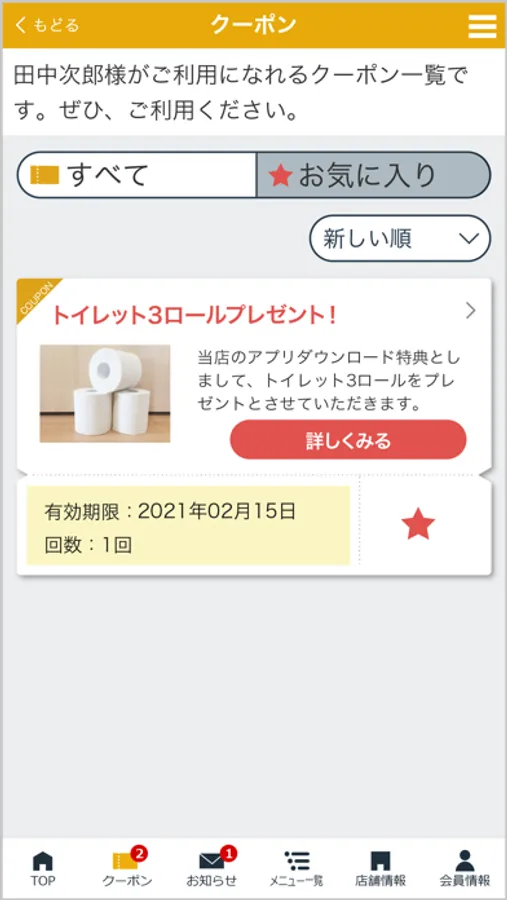 登録した店舗で実施中のキャンペーン情報や各種最新情報をお届けします。