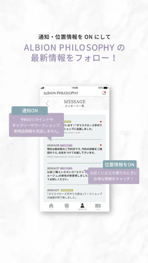 カウンセリング、肌分析、ワークショップの予約はアプリから。