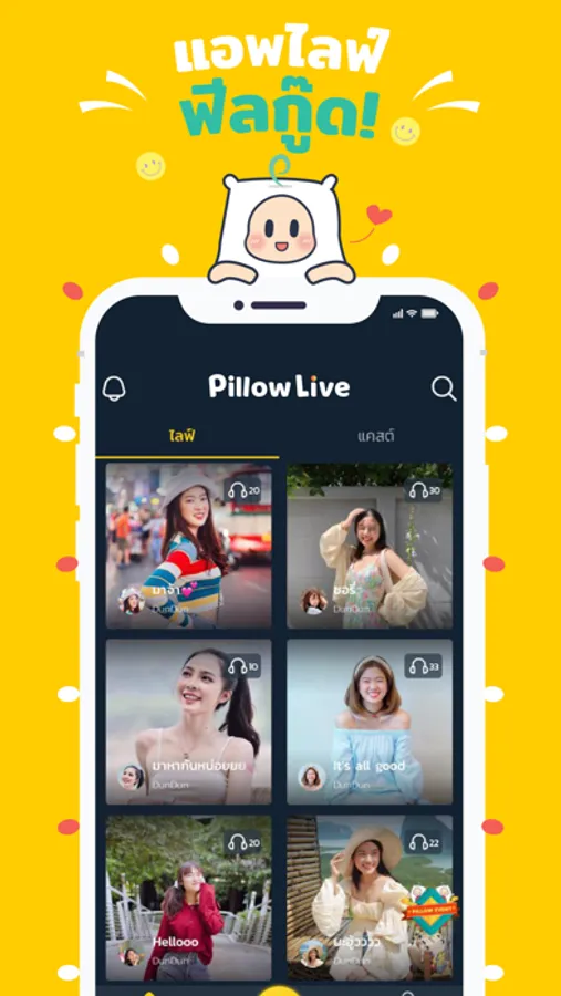 Pillow Live (พิลโล่ไลฟ์) แอปพลิเคชั่นไลฟ์สตรีมที่มีทั้งแบบเสียงและวิดีโอ สนุกกับการหาเพื่อน คุย ในคอมมูนิตี้ ได้พบปะกับเหล่าแคสเตอร์ ที่จะมาร่วมพูดคุย บอกเล่า และสร้างแรงบันดาลใจผ่านการไลฟ์ ไม่ว่าจะกำลังรู้สึกแบบไหน สุข เศร้า เหงา เซ็ง ก็สามารถเข้ามาพักผ่อน มาสนุก ในแอปพลิเคชั่น Pillow Live กันได้