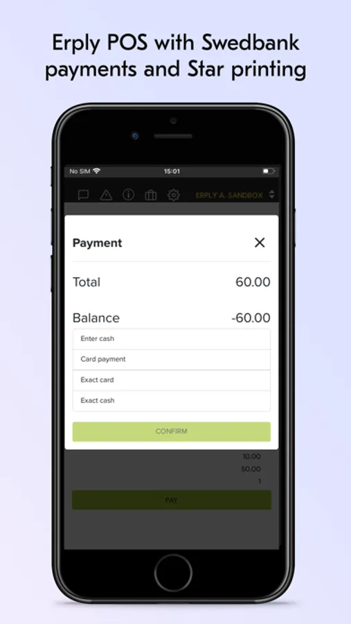 Accept card payments via WiFi using Swedbank payment terminal and print receipts using PassPRNT app.