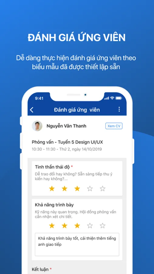 • Dễ dàng thực hiện đánh giá ứng viên theo yêu cầu của chuyên viên tuyển dụng