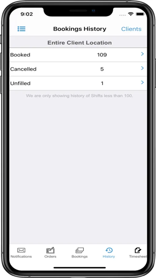 Includes a full history summary of all shifts ever ordered with your suppliers, including booked, cancelled and unfilled.