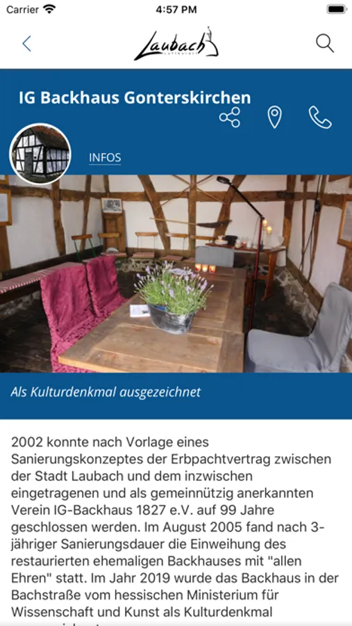 Nutzt alle Funktionen, die euer Smartphone bietet auch in der App! Lasst euch direkt zu den Events navigieren, die mit einem Klick auch in eurem Kalender sind - so verpasst ihr nix. Schaut rein und entdeckt eure Stadt Laubach!