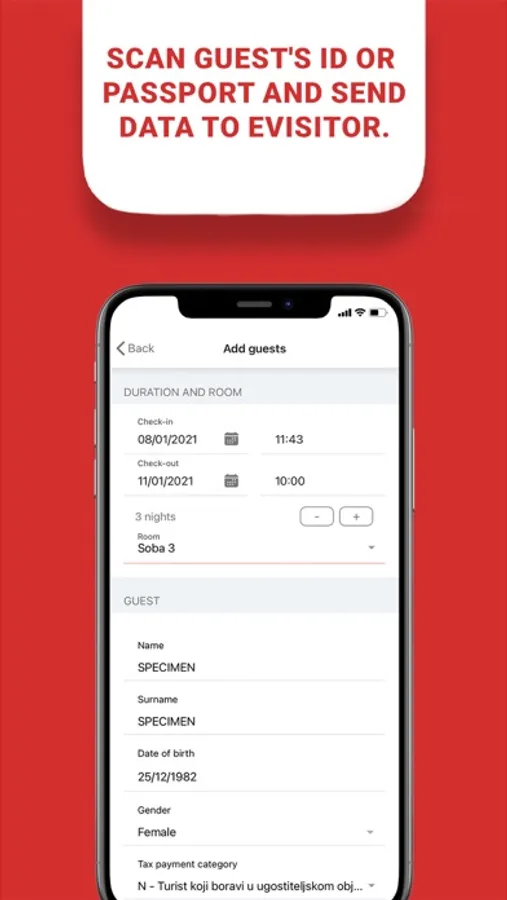 SnapGuest is a mobile app for quick guest registration to authorities. Using a smart device camera, the app allows you to scan a MRZ code on personal documents and send data directly to your eVisitor account.