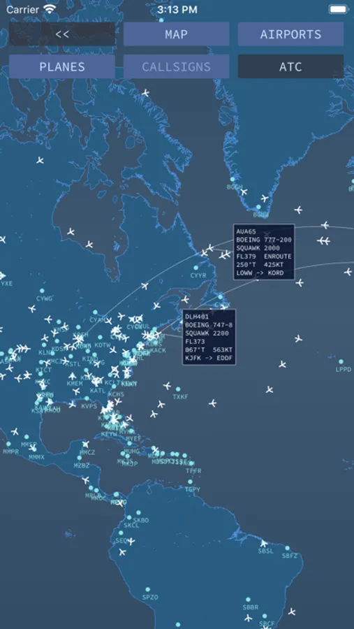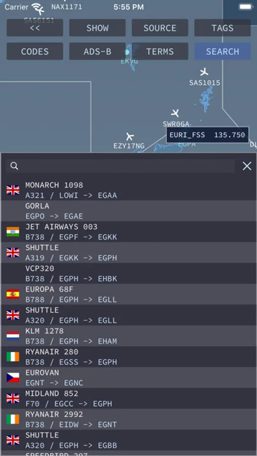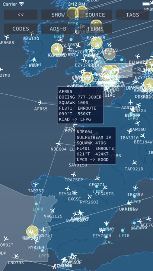 The data is retrieved from the online and public info servers of the respective networks (for which an Internet connection is required) at periodic intervals and traffic is plotted accordingly. Tapping on a plane (target) further discloses a tag with additional information about the flight such as its callsign, aircraft type, squawk, flight level, vertical speed, flight stage, course, speed, departure and arrival.