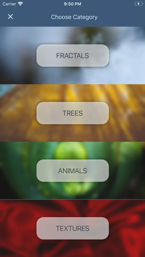 Currently, we offer a free app with four categories for you to choose: animals, nature fractals, trees and textures. Each day you will be given a seven-item careful selection of pictures, which broadly represents various moods and feelings, from anger to sadness to more complex experiences. Art therapist and coaching psychologist, having worked with groups and individuals using creative expressions, has selected the pictures based on the most common groups of moods and emotions.