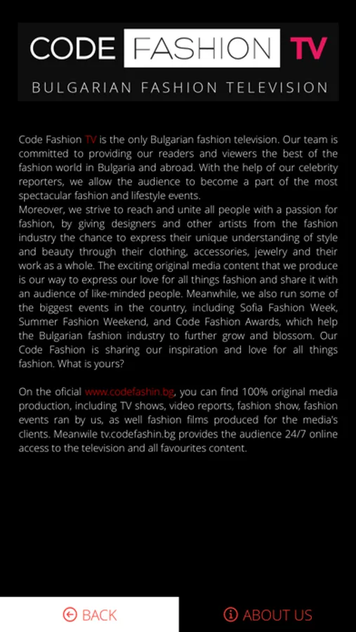 Code Fashion TV is the only Bulgarian fashion television. Our team is committed to providing our readers and viewers the best of the fashion world in Bulgaria and abroad. With the help of our celebrity reporters, we allow the audience to become a part of the most spectacular fashion and lifestyle events.