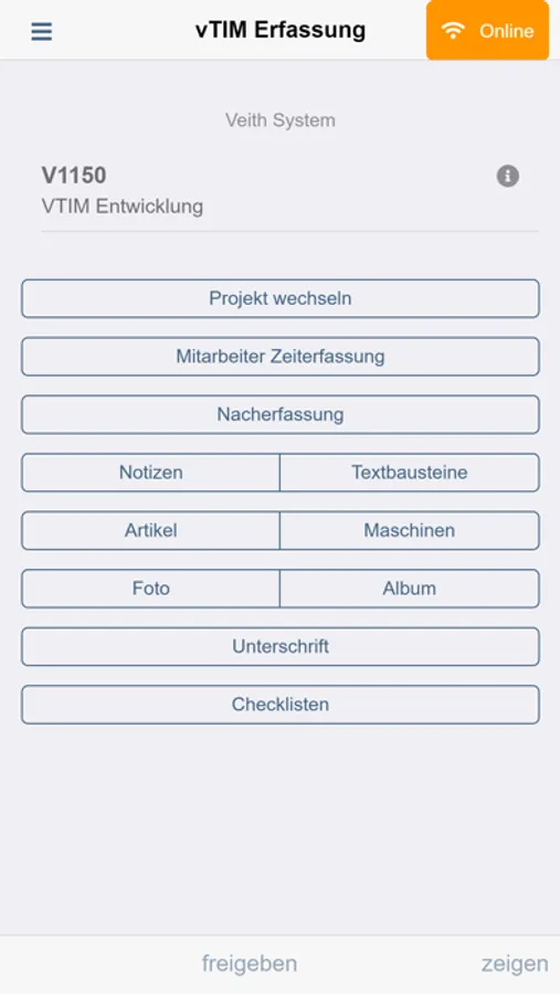 Die App erlaubt eine Projekt bezogene Erfassung von Tätigkeiten. Je nach Einstellung in der TIM Zeiterfassung Software können die Zeiten in Echtzeit (Zeitstempel) oder nachträglich (Nacherfassung) erfasst werden. Neben Zeiten können auch andere Ressourcen wie Artikel Projekt bezogen erfasst werden.
