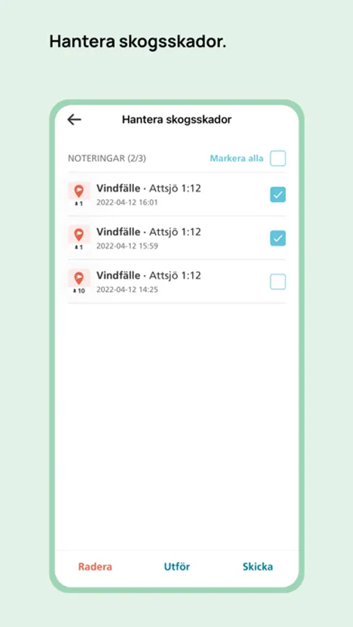 - Skicka ärenden direkt till din skogsinspektor – till exempel noteringar om vindfällen och granbarkborreangrepp.