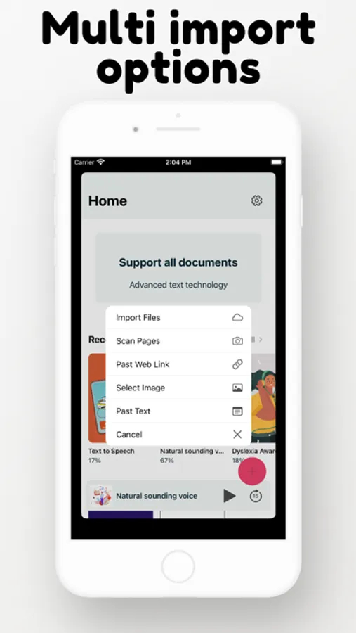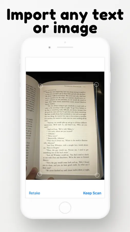 • Import Books, PDFs, text images, book scans website articles, and turn them into Audio.