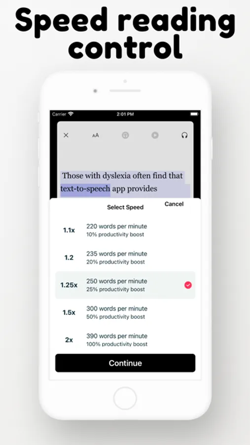 Odiofy will increase your productivity by reading more and reading faster using the Text reader screen which highlights every word while the reader is reading.