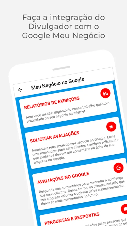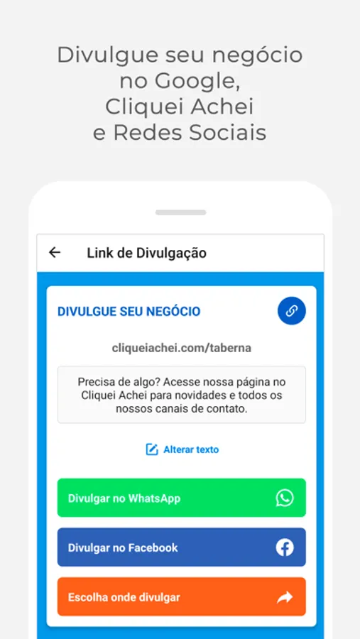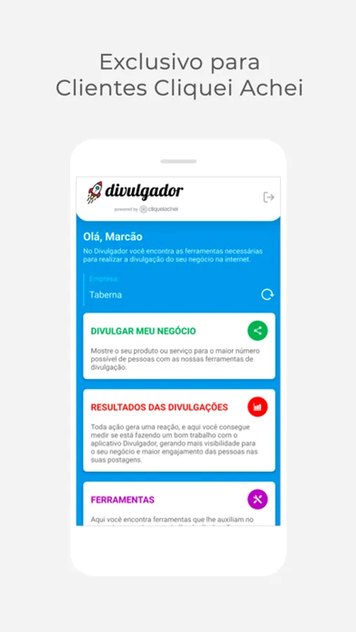 O aplicativo Divulgador é uma solução criada pelo Cliquei Achei para que micro e pequenos empresários possam divulgar sua empresa de forma fácil na internet e também acompanhar os resultados.