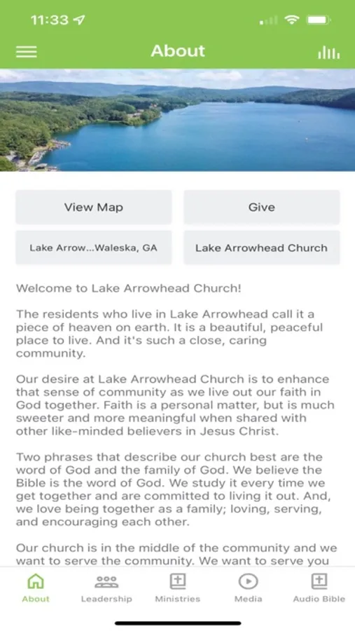 The official Lake Arrowhead Church App connects you to the life and ministry of our church, located in the heart of the Lake Arrowhead community near Waleska, Georgia. This app provides information on upcoming events, both video and manuscripts of recent messages, a map to find our location, and information on all the ministries of our church and how you can get connected.