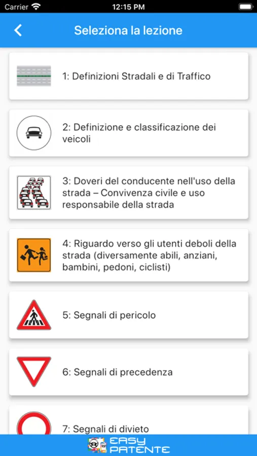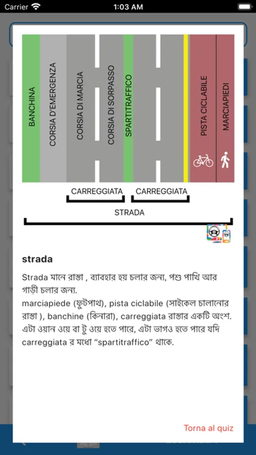 Leggi un contenuto per imparare una definizione o cosa fare e cosa non fare sulla strada, poi ti eserciti con i gruppi di quiz relativi al contenuto che hai scelto di studiare. In questo modo è molto più facile capire cosa vogliono dire tutte le parole che compongono i quiz.