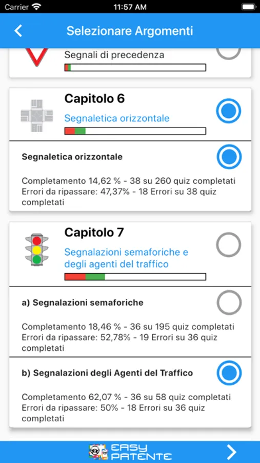 Per farti percepire immediatamente i tuoi progressi e rendere più rapida la selezione degli argomenti, hai le statistiche di ogni argomento direttamente nella schermata di selezione degli argomenti.