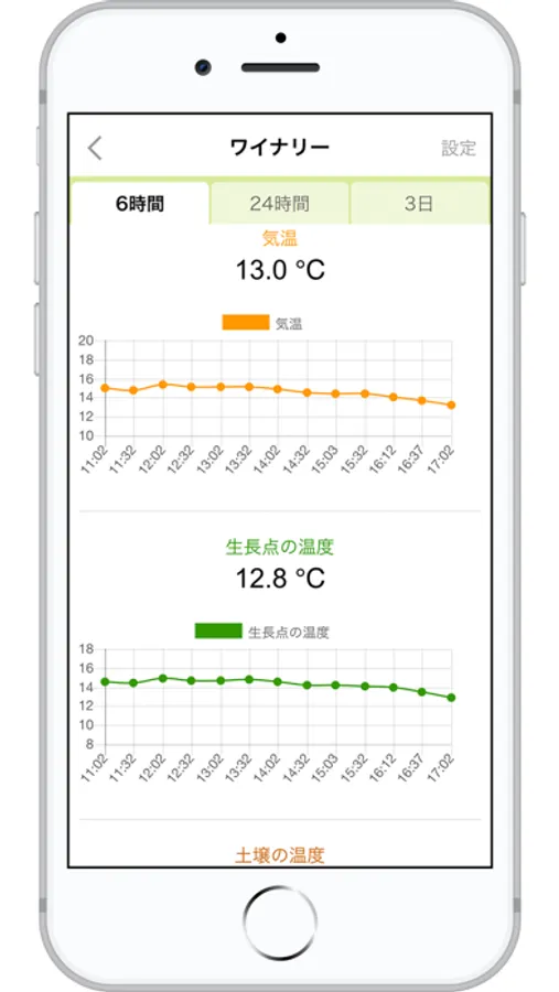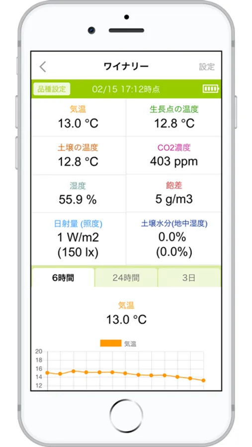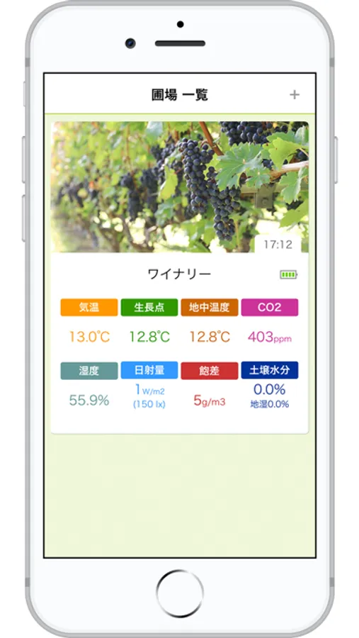 圃場の気温や湿度、成長点温度、地中温度、CO2濃度などを計測することができ、良質なぶどう作りをサポートします。