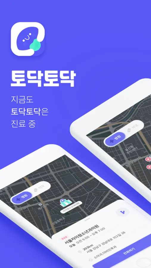 ‘토닥토닥’을 통해서 원하는 시간에 운영하는 병원과 약국을 지도에서 한번에 찾아보세요.