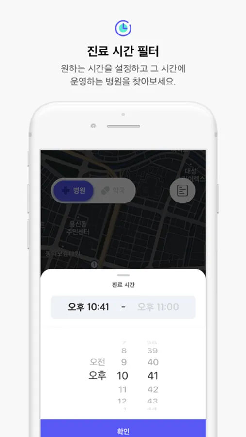 내가 원하는 시간을 입력하고 지도에서 해당 시간에 운영하고 있는 병원을 알아볼 수 있습니다. 더 이상 각 병원 정보에서 영업시간을 확인하고 전화하는 귀찮음을 겪지 마세요.
