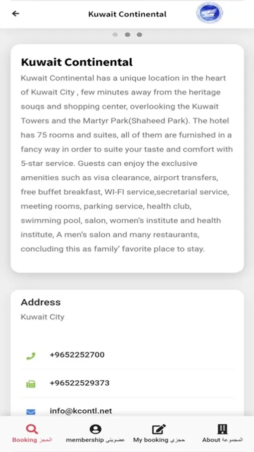 فندق كويت كونتيننتال هو فندق أربع نجوم يقدم خدمات ومرافق خمس نجوم. يحتوي الفندق على عدد كبير من الغرف الاجنحة المؤثثة بشكل جذاب ، وخدمة غسيل الملابس والتنظيف الجاف في نفس اليوم ، واستئجار سيارة ، وخزنة ، وموقف للسيارات