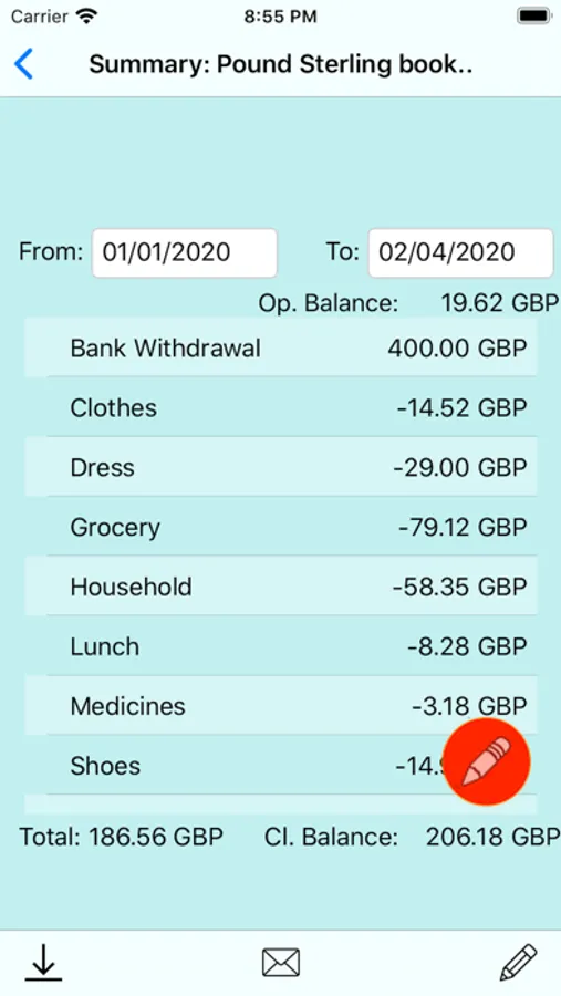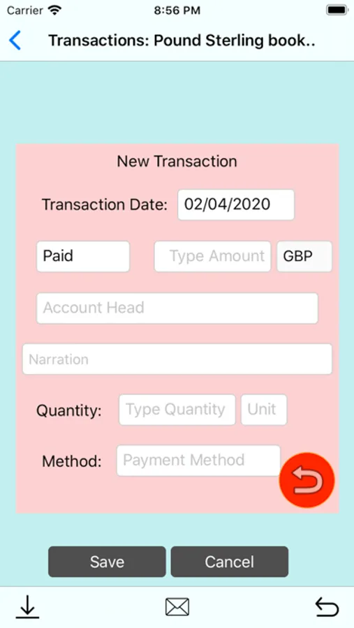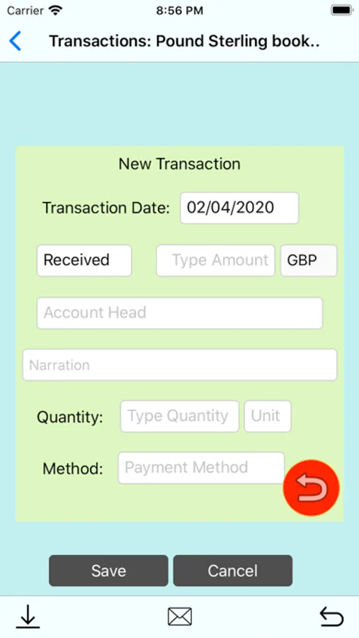 You can record transactions for any date and the app updates the balances and totals accordingly. On each transaction you must enter a date, amount and an account head. Additionally you may enter a partner, narration, quantity, payment method and classification.